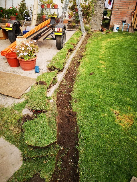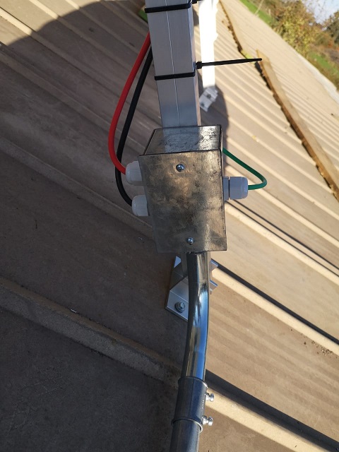La canalización desde los paneles fotovoltaicos hacia el inversor se realizo con tubería EMT a la vista y conduit en el tramo soterrado, se consideró una tierra de protección independiente para el sistema fotovoltaico y se colocó una cámara de registro cercana al inversor Voltronic Axpert Max. Para el cableado se utilizó cable solar de 4mm que tiene como ventaja su resistencia a los rayos UV y una vida útil a la intemperie de 25 años aproximadamente. A continuación algunas imagenes del proceso de instalación del cableado fotovoltaico.