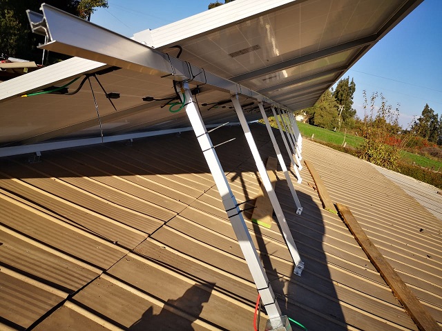 La estructura de montaje utilizada es con inclinación máxima de 60° y se utilizo a 50° para compensar la inclinación del techo que tenia 15° hacia el sur, con ello los paneles quedaron con una inclinación 35° hacia el norte para aprovechar de buena manera la radiación incidente en las distintas temporadas del año.