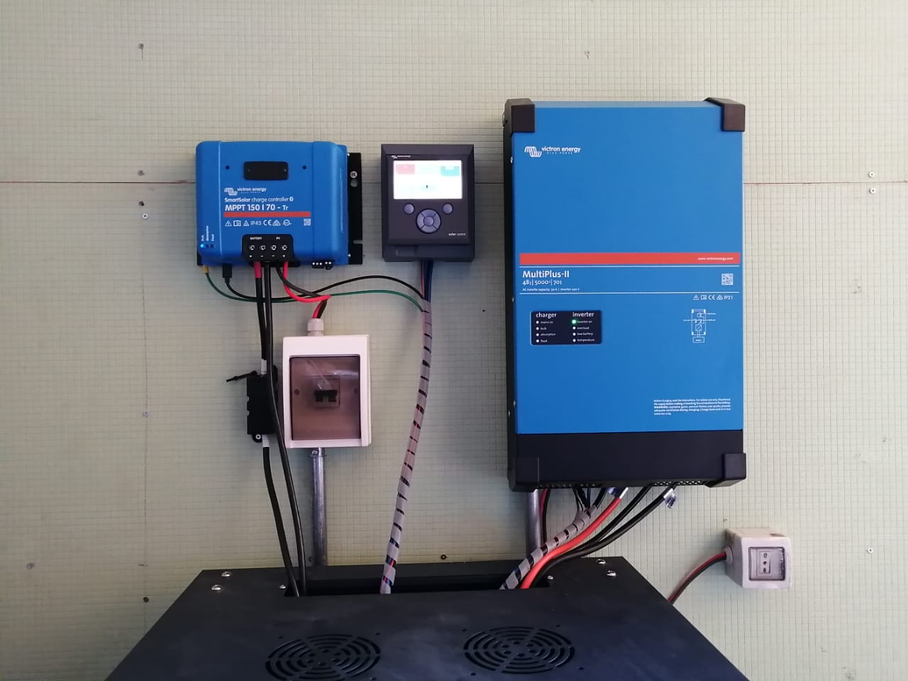 En términos técnicos este proyecto utiliza un inversor Multiplus II, un controlador MPPT SmartSolar y el gestor Color Control GX de la marca Victron Energy, además integra un banco de baterías de litio de 4.8kWh de la marca Pylontech para almacenamiento de energía. Todo lo anterior se abastece de 9 paneles solares de 72 celdas policristalinos de ultima generación.
