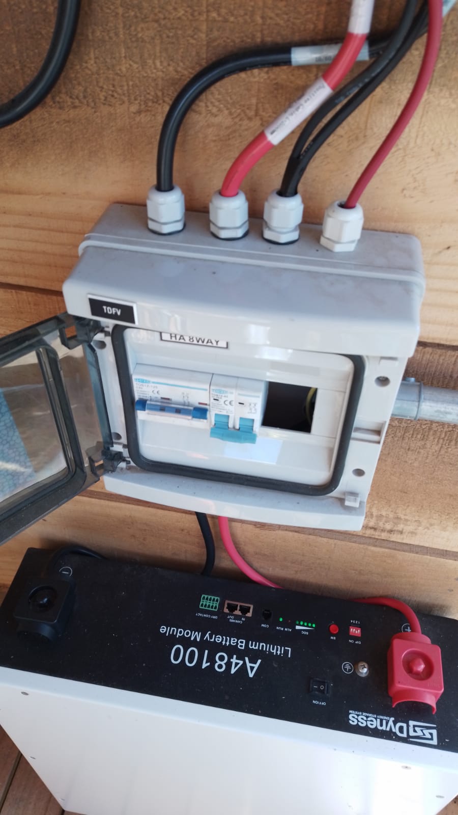 El corazón de este sistema fotovoltaico Off Grid es un inversor de 6.2kW que se combina con una batería de litio de alta calidad de la marca Dyness. Junto a este equipo, se instalaron 6 paneles solares de 450Wp cada uno, que aprovechan al máximo la generosa radiación solar de verano de la región de Los Lagos.