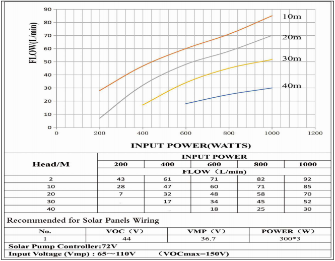 Bomba Solar Sumergible con cuerpo de 3 pulgadas, caudal máximo de 5.7m3/hr y elevación máxima de 49mca, su motor es de 0.7HP y posee controlador MPPT integrado.