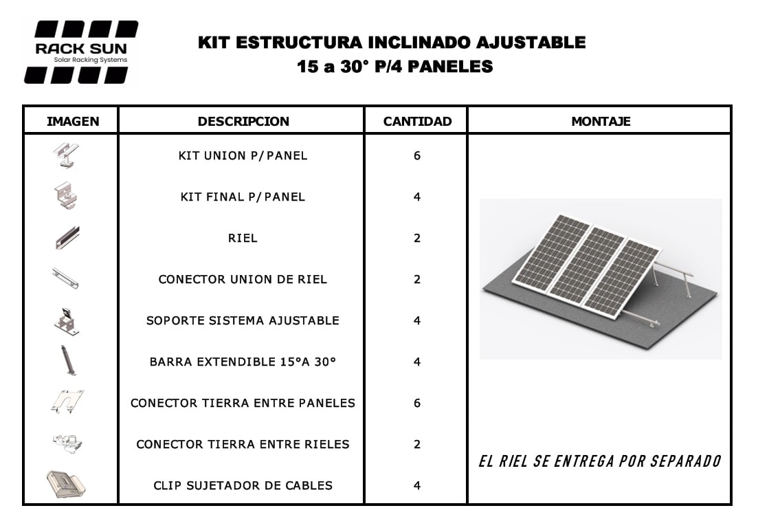 Estructura ajustable para 4 paneles solares. Ángulo ajustable de 15° a 30° para adaptarse a distintos requerimientos de inclinación, solución de aluminio anonizado, resistente y fácil de instalar.