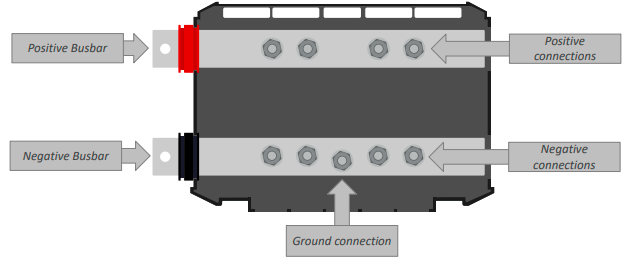 Una barra de bus CC modular que se emplea para conectar las baterías al sistema de distribución Lynx CC.